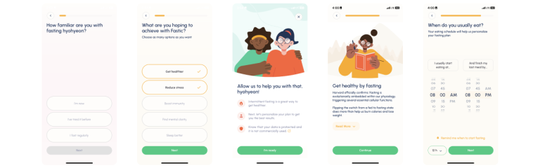 그 외로 정보 제출을 지루하지 않도록 할 수도 있습니다. 독일의 건강관리 어플 Fastic은 온보딩 설문에서 많은 정보를 수집합니다. 하지만 다양한 UI 요소로 설문을 지루하지 않도록 만들었고, 높은 설문 완료율을 기록하고 있습니다.
