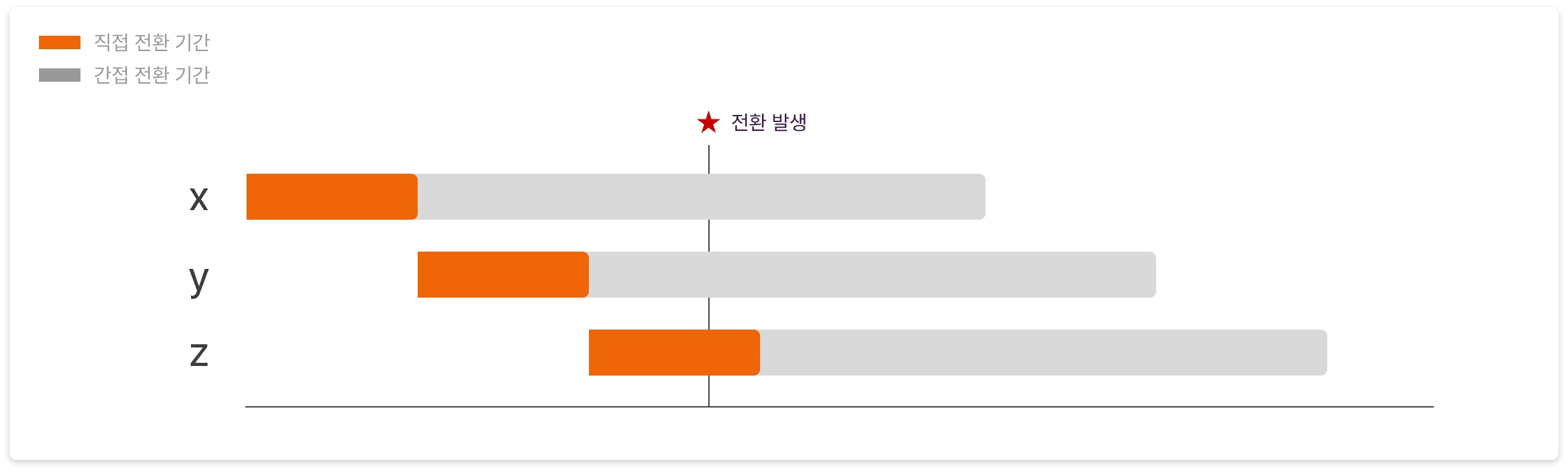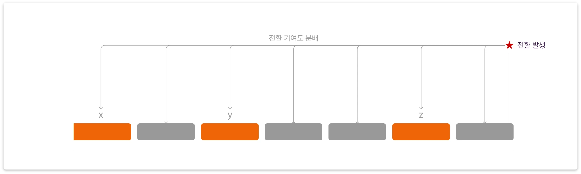 위 예시에서 유저 A는 x, y, z의 광고 매체에서 송출된 광고를 모두 클릭했습니다. 그리고 3일째가 되는 날 유저 A는 상품을 구매했죠. 그렇다면 여기서 구매에 대한 전환값은 누가 가져갈까요?