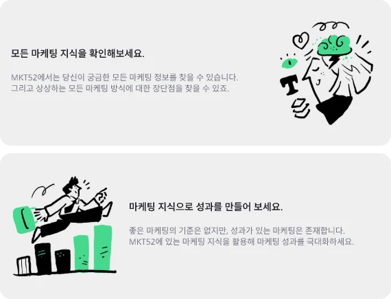 <div><span>MKT52에서는 당신이 궁금한 모든 마케팅 정보를 찾을 수 있습니다.<div class="_p"></div>그리고 상상하는 모든 마케팅 방식에 대한 장단점을 찾을 수 있죠.</span></div>