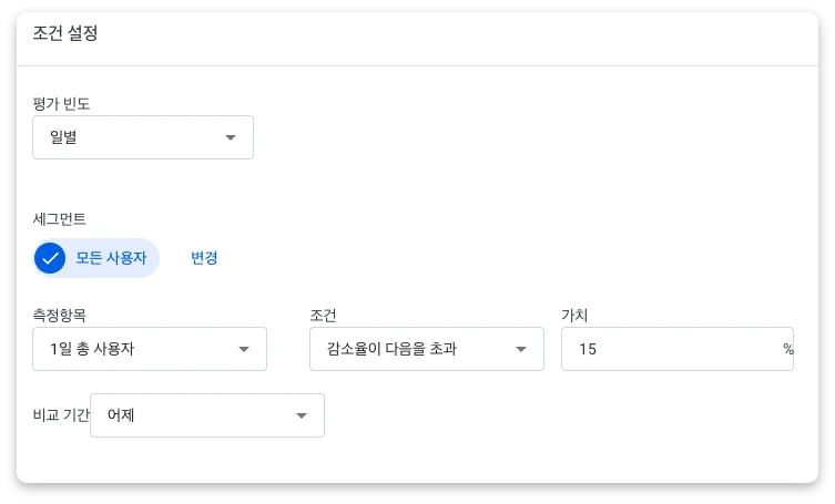 "방문자가 지난 날보다 크게 감소한 경우, 사이트 이상이 발생한 것일 수 있다."는 가설을 세웠다면, 위와 같이 조건을 설정할 수 있습니다. 측정 항목은 1일 총 사용자로 설정한 후, 조건은 감소율이 다음을 초과, 가치로 이상율을 설정합니다. 그리고 비교를 전일 혹은 지난주 등으로 설정해서 데이터 이상을 확인할 수 있습니다.