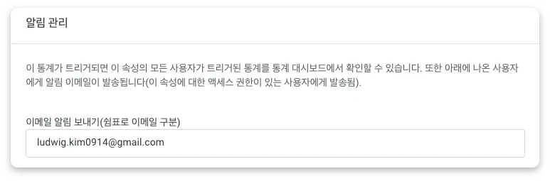 조건 설정을 완료 후 하단에 있는 알림 관리에 이메일을 지정 후 상단의 만들기를 클릭하면 완료됩니다. 이메일은 GA4 속성에 접근한 이메일이 자동으로 입력됩니다.