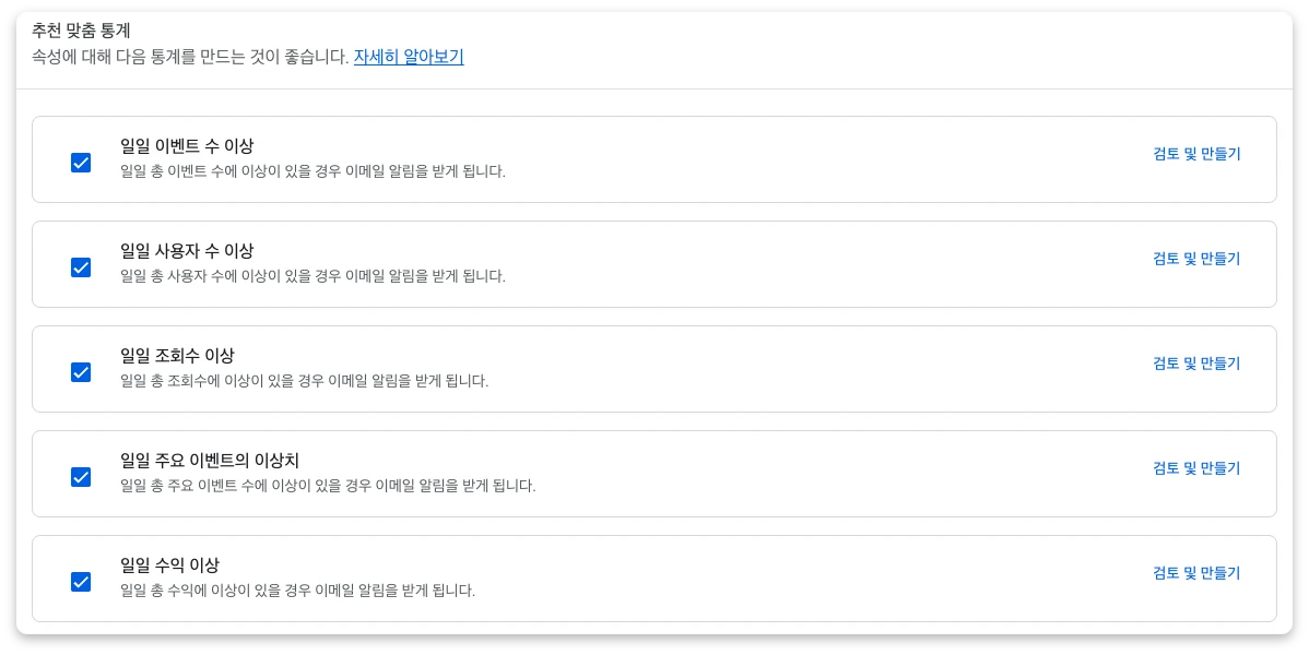 GA4에서는 기본적으로 5개의 추천 통계 조건이 존재합니다. 하지만 대부분 불일치 발생 시 나타나는 조건입니다. 감소나 증가에 따른 알림을 받고 싶다면, 우측 검토 및 만들기를 클릭합니다.