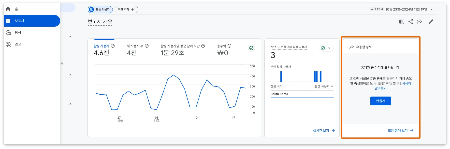 좌측 탭의 보고서를 클릭하면, 보고서 개요로 이동이 됩니다. 여기서 우측 3번째 카드로 있는 유용한 정보 부분을 확인하면 만들기 버튼이 존재합니다. 여기서 만들기 버튼을 클릭하면 맞춤 알림 기능을 설정할 수 있습니다.