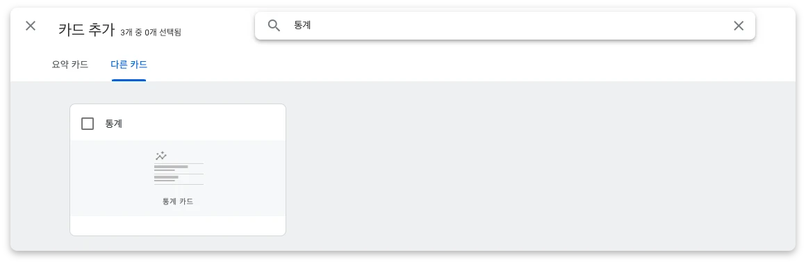 카드 추가 항목 중 검색 바로 하단에 존재하는 다른 카드를 클릭한 후, 통계를 검색해서 추가해 주시면 됩니다.