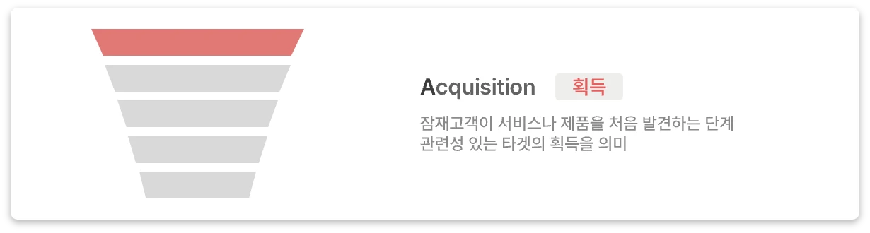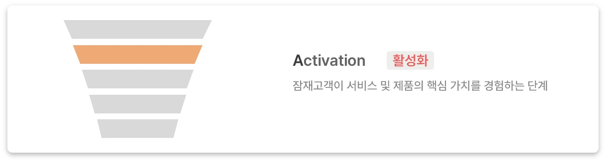 잠재고객이 서비스나 제품을 처음 발견하는 단계입니다. 획득 단계에서 중요한 것은 단순히 많은 유저들이 서비스/제품을 알게 됐고, 유입됐다가 아닙니다. “관련성 있는 타겟의 획득”이 더욱 중요합니다. 만약 타겟의 획득이 아니라면, 바로 아래 단계인 Activation 활성화 단계로 넘어가지 못하고 이탈되는 비율이 높아지겠죠.
