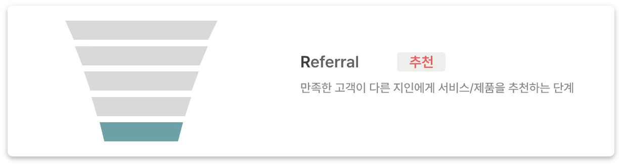 만족한 고객이 다른 지인에게 서비스/제품을 추천하는 단계입니다. 제품 만족에 대해 가장 좋은 지표이기도 합니다. 특히, 서비스가 어느정도 성장하거나 시장이 과열될수록 Referral 추천이 중요해집니다. 특히 Referral 추천 유입은 비용이 발생하지 않으며, 유료 고객으로 전환되는 경우가 높습니다.