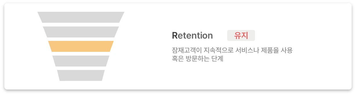 잠재고객이 지속적으로 서비스나 제품을 사용하는 단계를 의미합니다. 1회성 서비스가 아닌 이상, 서비스나 제품을 사용한 후에는 지속적인 재사용 혹은 재방문이 이뤄지는지 확인해야 합니다. 즉, 고객이 지속적으로 가치를 얻을 수 있는지 확인하는 단계이죠.