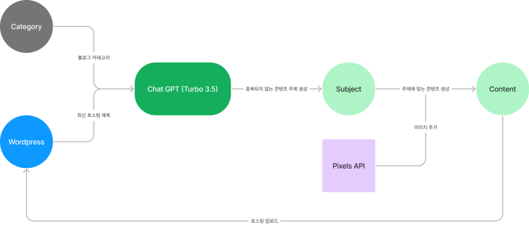 자동화 블로그 진행을 위해서 사용한 것은 wordpress, pixels api, gpt api를 사용했고, python에서는 wordpress_xmlrpc 라이브러리를 활용했습니다.
