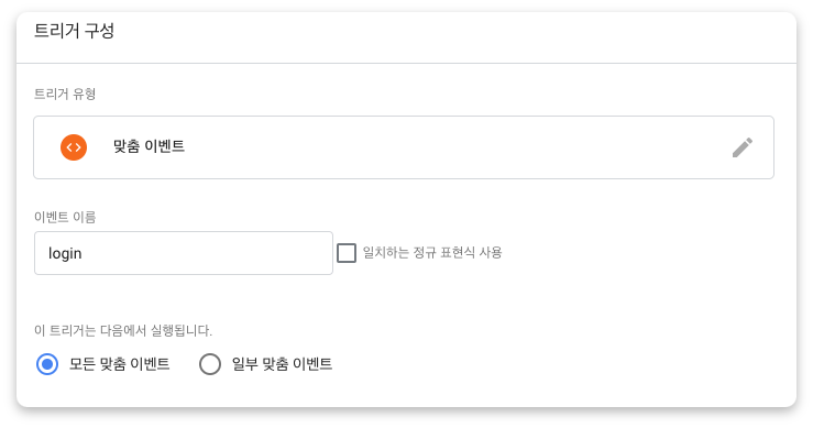 위 과정은 이벤트 실행 조건을 설정하는 것으로 데이터 레이어가 송출되는 것으로 이벤트를 실행하게 됩니다.