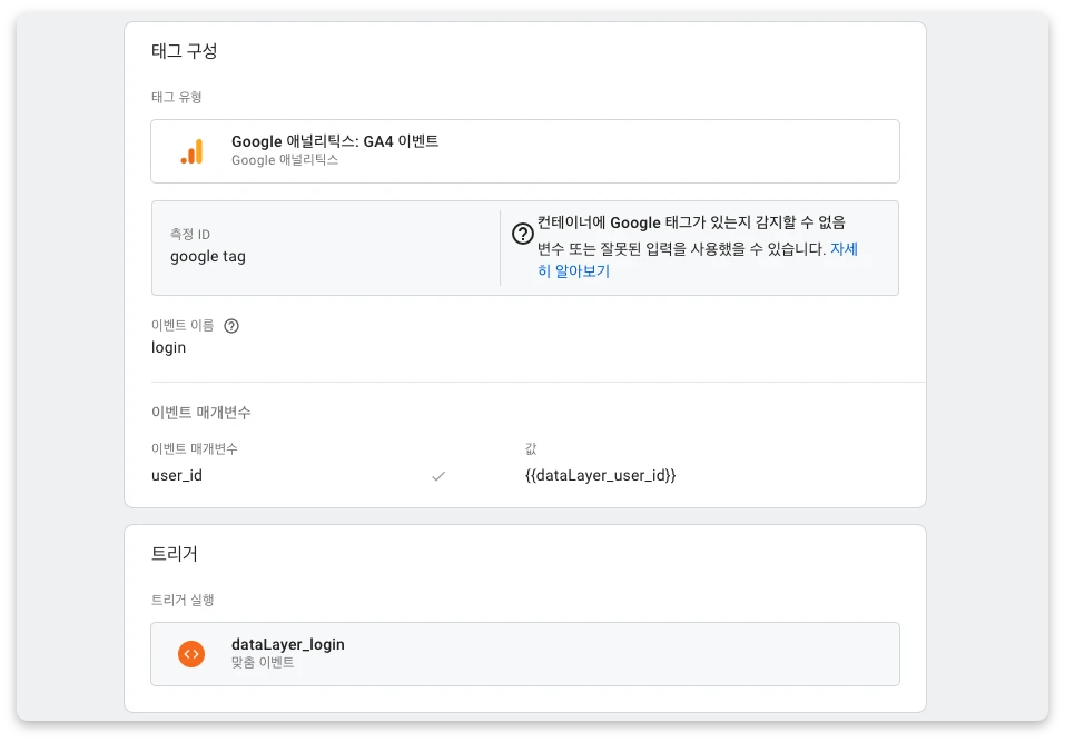 데이터 레이어는 그 자체로 사용할 수 없기에 그 안에 포함된 값을 직접 설정해서 사용해야 합니다. 특히, 직접 설정한 키 값(위 예시에서 user_id